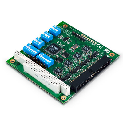Carte série PC/104 à 4 ports RS-232/422/485, connecteur 40-pin, de 50 à 921.6 Kbps, FIFO 64 bytes, contrôle du flux logiciel sur puce, IRQ, E/S et interface série réglables par cavalier ou switch DIP, protection ESD 15 KV, supporte Windows CE 5.0 et Windows XP