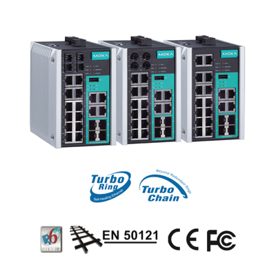 Commutateur Ethernet Gigabit manageable 12 ports 10/100BaseT(X), 4 ports 10/100/1000BaseT(X) ou 100/1000BaseSFP, 2 ports multimode 100BaseFX avec connecteurs SC, températures -40 à 75 °C