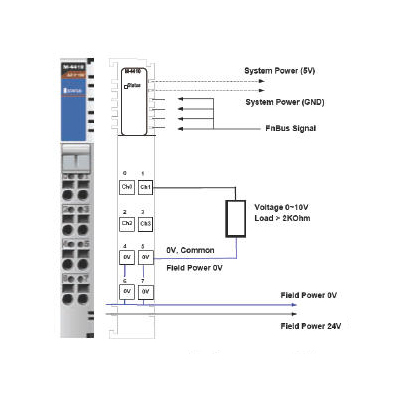 E/S modulaire à distance avec 4 sorties analogiques, résolution 12 bits, 0 à 10 VDC, impédance 5K ohms, RTB, températures en fonctionnement de -10 à 60°C, isolation photocoupler, RoHS