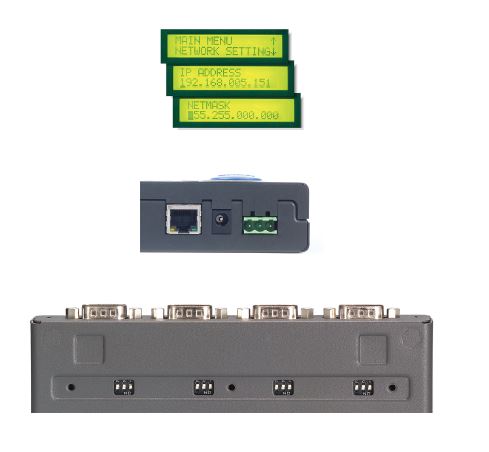 Serveur de périphériques série RS-422/485 à 4 ports isolés 2kV, connecteur DB9 mâle, avec écran LCD, 50 bps à 921.6 Kbps, alimentation 12-48V DC, températures 0 à 55 °C