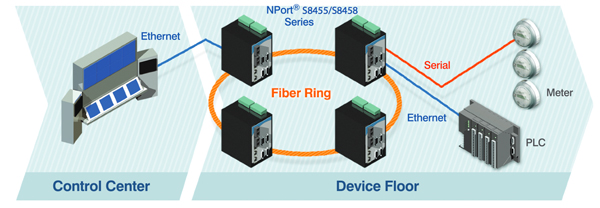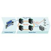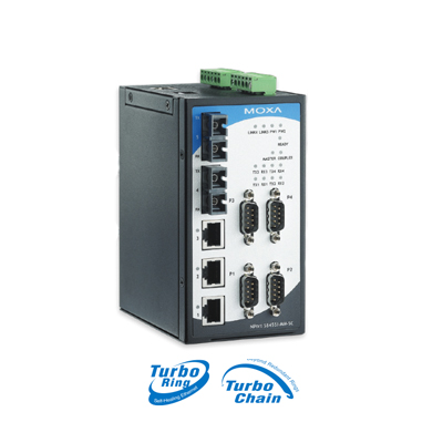 Combiné commutateur Ethernet manageable / Serveur de périphériques 4 ports RS-232/422/485, 3 ports 10/100, 2 ports fibre monomode connecteur SC, 12-48 VDC, 0 à 60 °C